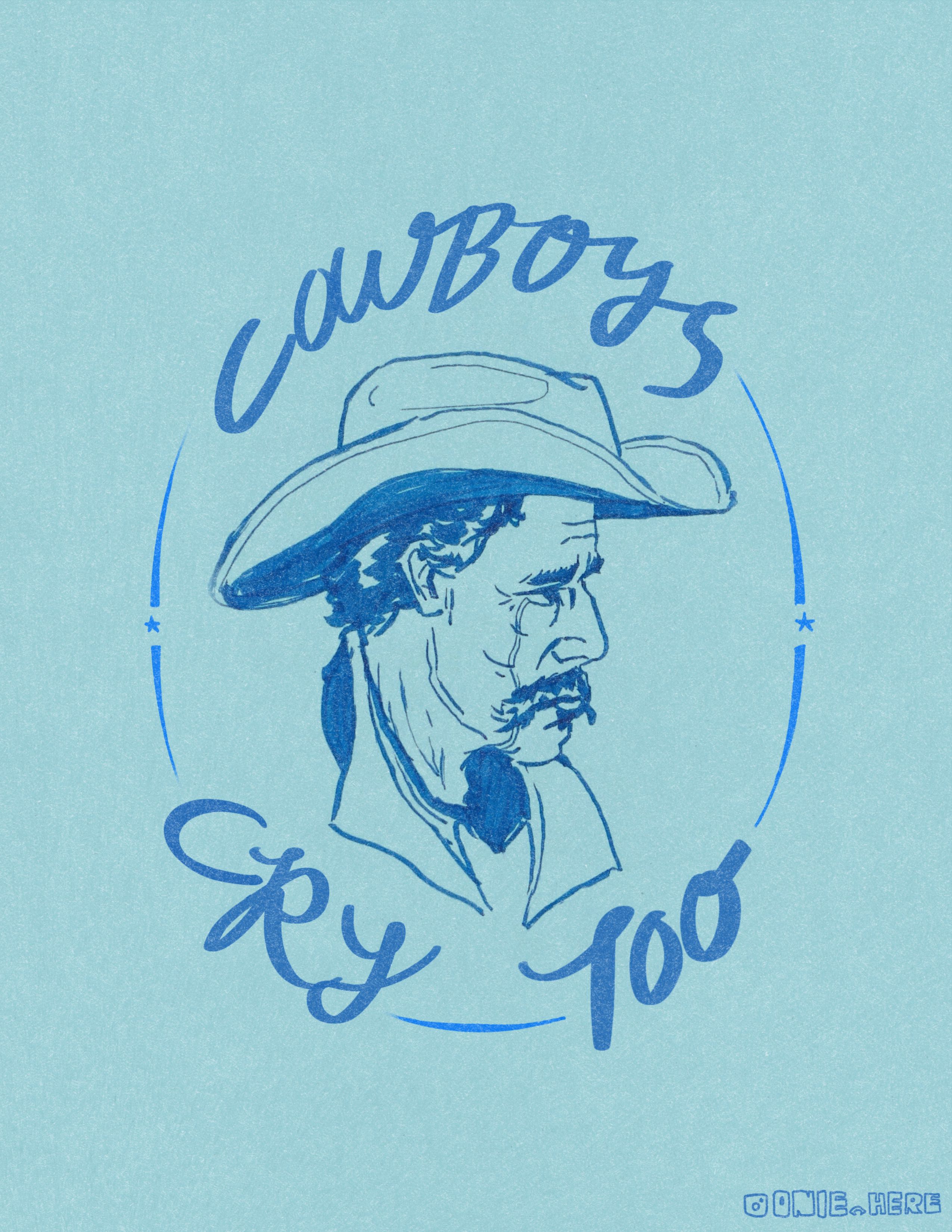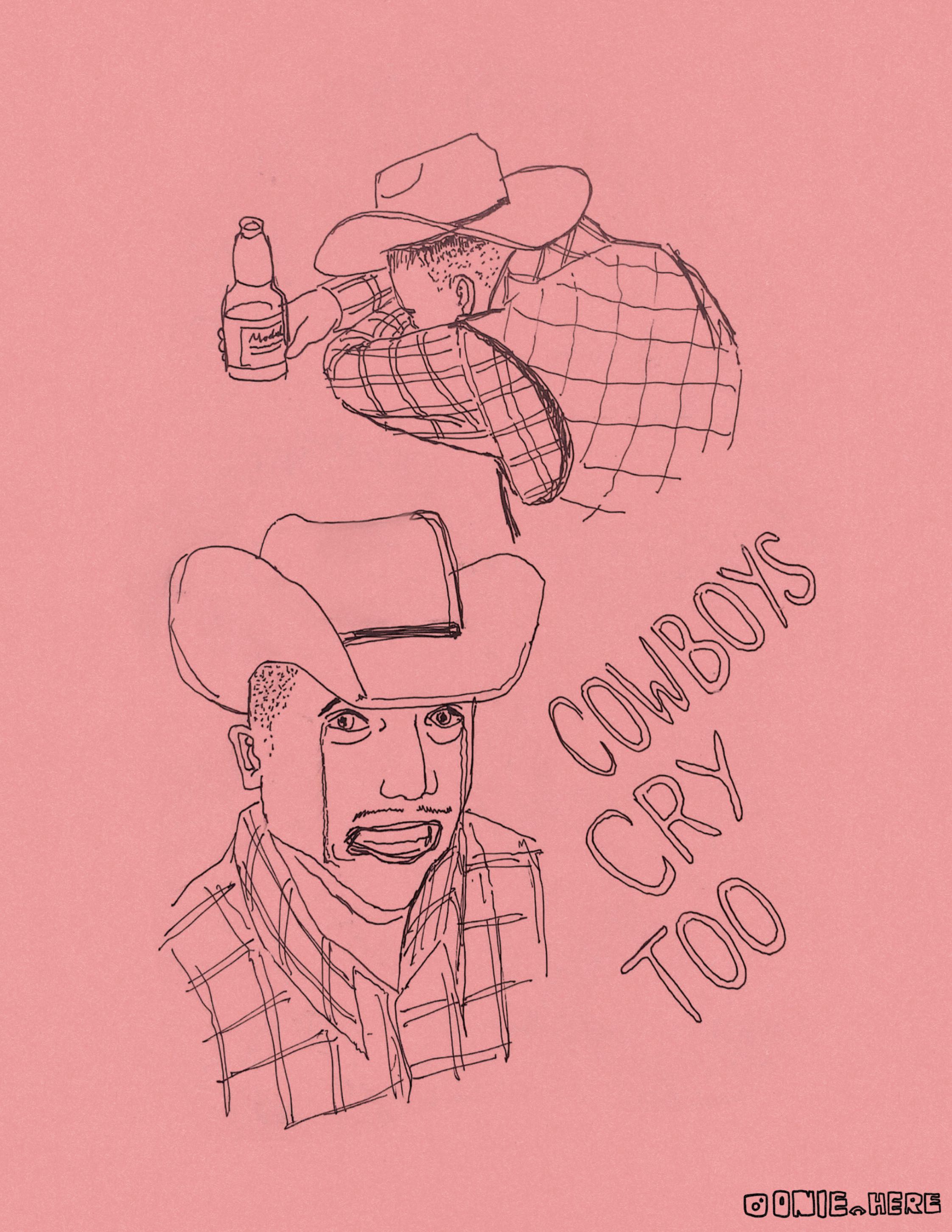 Crying cowboys are definitely a motif in my work. I started drawing them sort of as a joke art first, but as I drew more and more of them they became more meaningful to me. The cowboy is one of the most stereotypically macho male figures -so I thought why not make him cry. People think of cowboys as strong, and I'm not trying to challenge that but rather challenge the idea of what strength is. I believe that vulnerability, and allowing tears to flow, is a true show of strength.